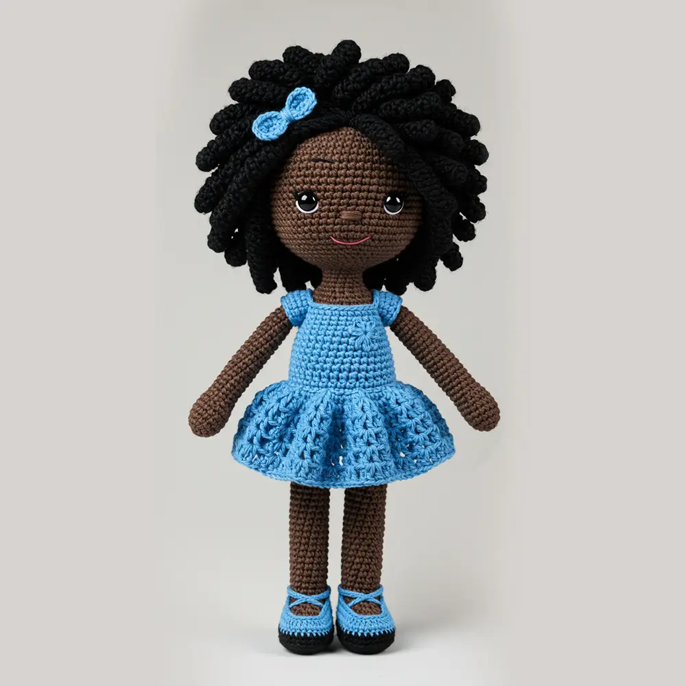 Whether for play or as a collectorโs item, this curly-haired crochet doll brings charm and personality. The vibrant blue outfit and expressive eyes add to its irresistible appeal.