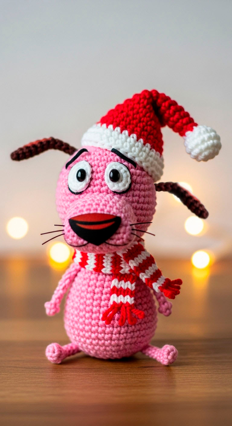Discover the delightful charm of this Courage the Cowardly Dog crochet figure, perfectly capturing the beloved character in a festive light. Adorned with a classic Santa hat and a cozy striped scarf, this amigurumi piece brings a touch of nostalgic holiday cheer. It showcases incredible craftsmanship, highlighting the intricate details that make handmade items so special. This Courage the Cowardly Dog crochet creation is truly a unique and heartwarming decoration for any fan.