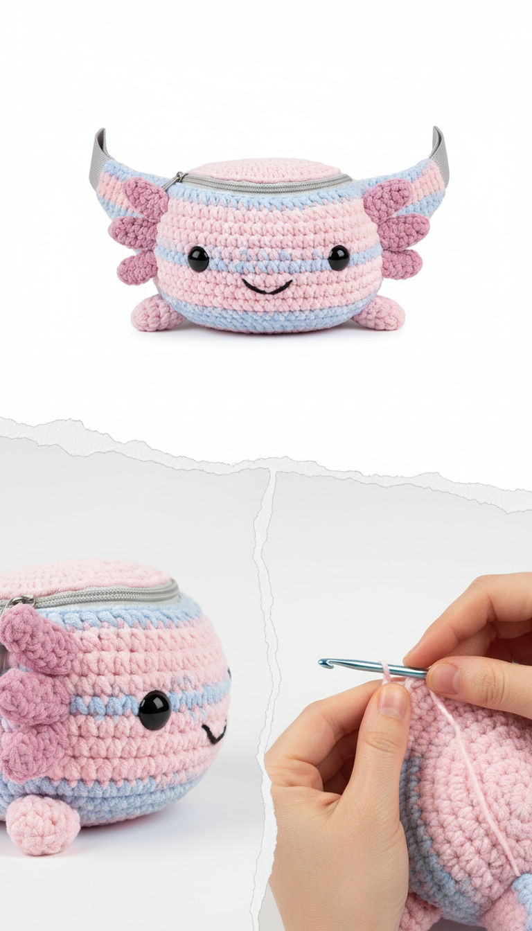 Dive into the delightful world of amigurumi with our charming Crochet Axolotl Fanny Pack pattern! This adorable and functional project lets you create a unique accessory that’s as cute as it is practical. With its sweet smile, vibrant stripes, and signature frilly gills, this axolotl pouch is sure to turn heads and keep your essentials close by in the most enchanting way.