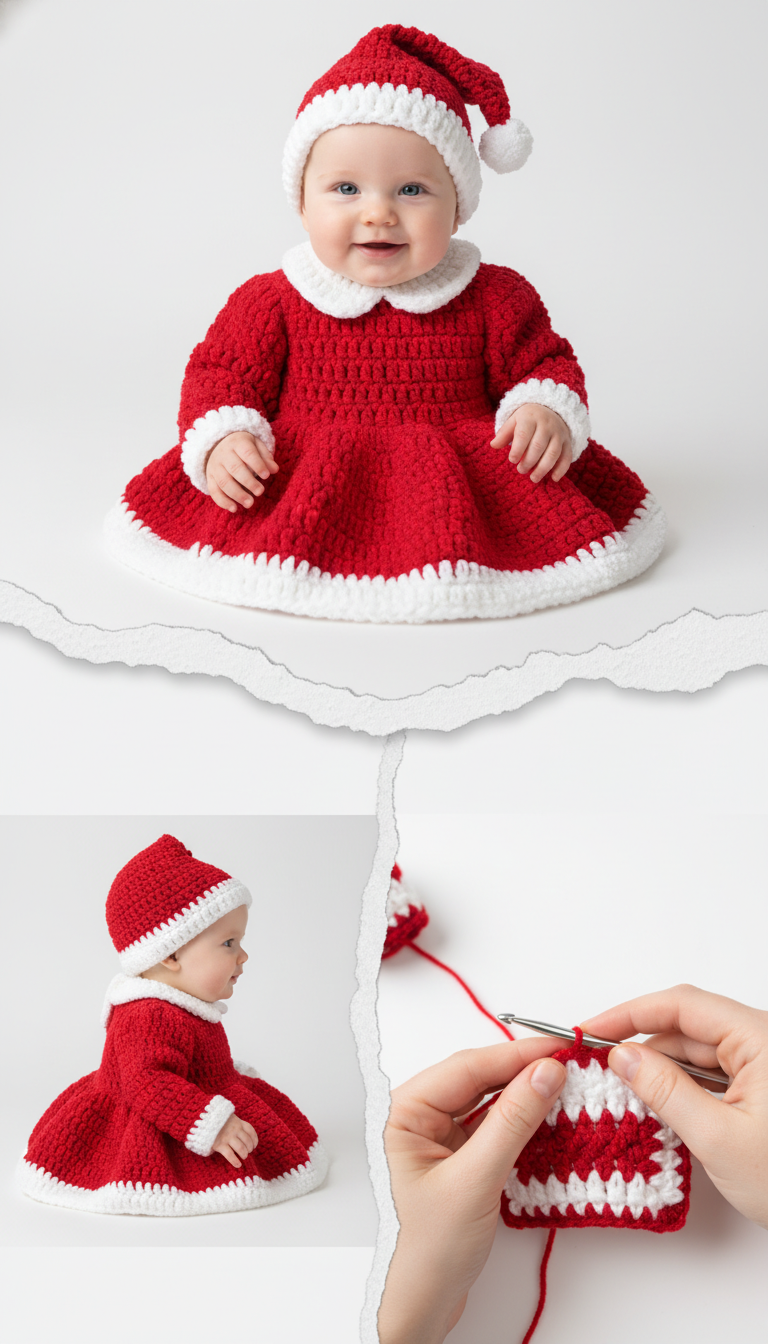 Get ready to spread holiday cheer with this adorable Crochet Baby Santa Outfit! Perfect for baby’s first Christmas photos, holiday parties, or a thoughtful handmade gift, this charming set includes a festive dress and a matching Santa hat. Crocheted in classic red and white, it’s designed to make your little one look irresistibly cute this festive season.