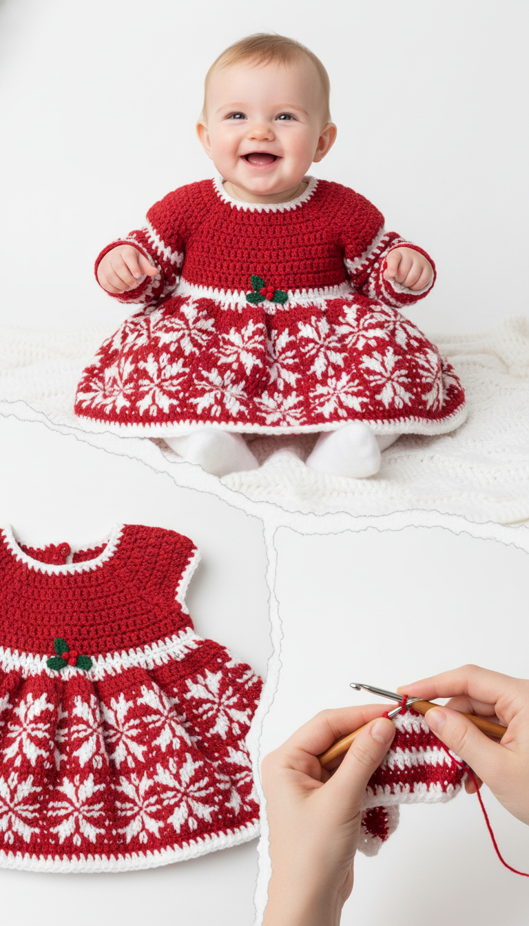 Get ready to spread holiday cheer with this charming Crochet Snowflake Baby Dress! Perfect for your little one’s first festive season or any special winter occasion, this pattern guides you through creating a beautiful, handmade garment. Featuring a classic red and white design with intricate snowflake details, it’s a truly special piece that will be cherished for years to come.