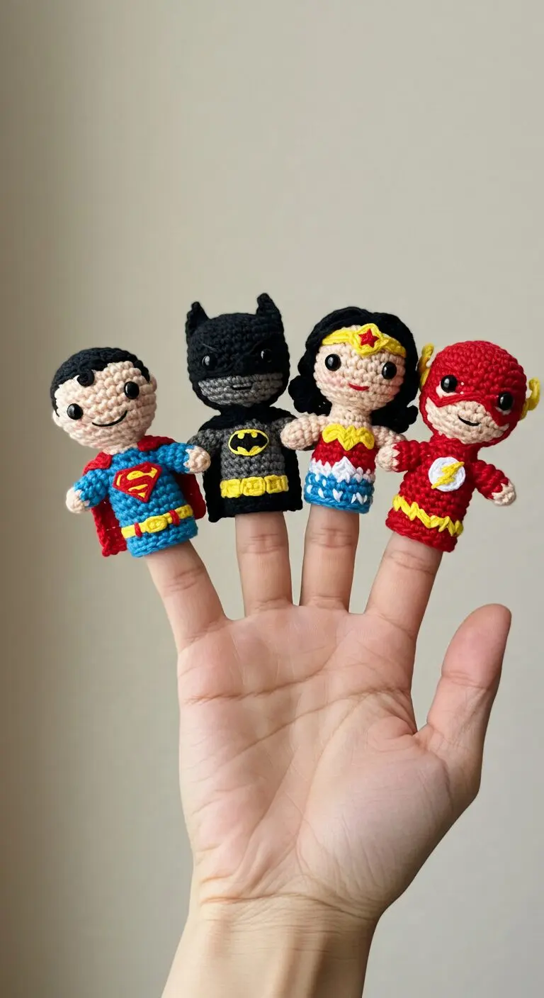 Dive into the world of handmade heroes with these charming crochet superhero finger puppets. Featuring iconic DC characters like Superman, Batman, Wonder Woman, and The Flash, these miniature creations are perfect for imaginative play. Each puppet is meticulously crafted, showcasing the unique details of these beloved figures. They offer a delightful way to bring storytelling and creativity to life for both children and adults. Discover the joy of these unique superhero finger puppets.