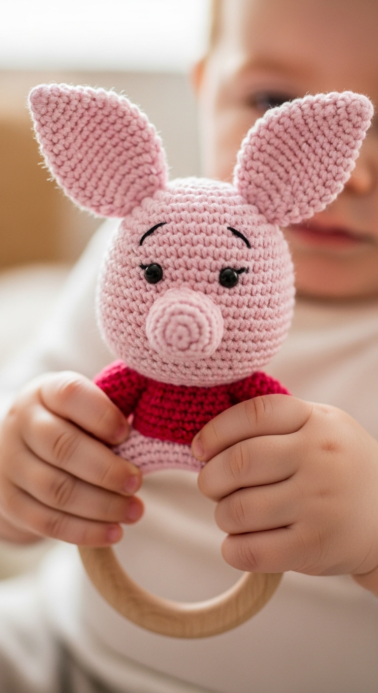 Craft a charming and safe companion for your little one with this free crochet pattern for an adorable Piggy Amigurumi Teether! This project is perfect for gifting, combining the softness of crochet with the natural texture of a wooden ring. Designed to be both a comforting friend and a practical teether, this piglet will bring joy to any baby.