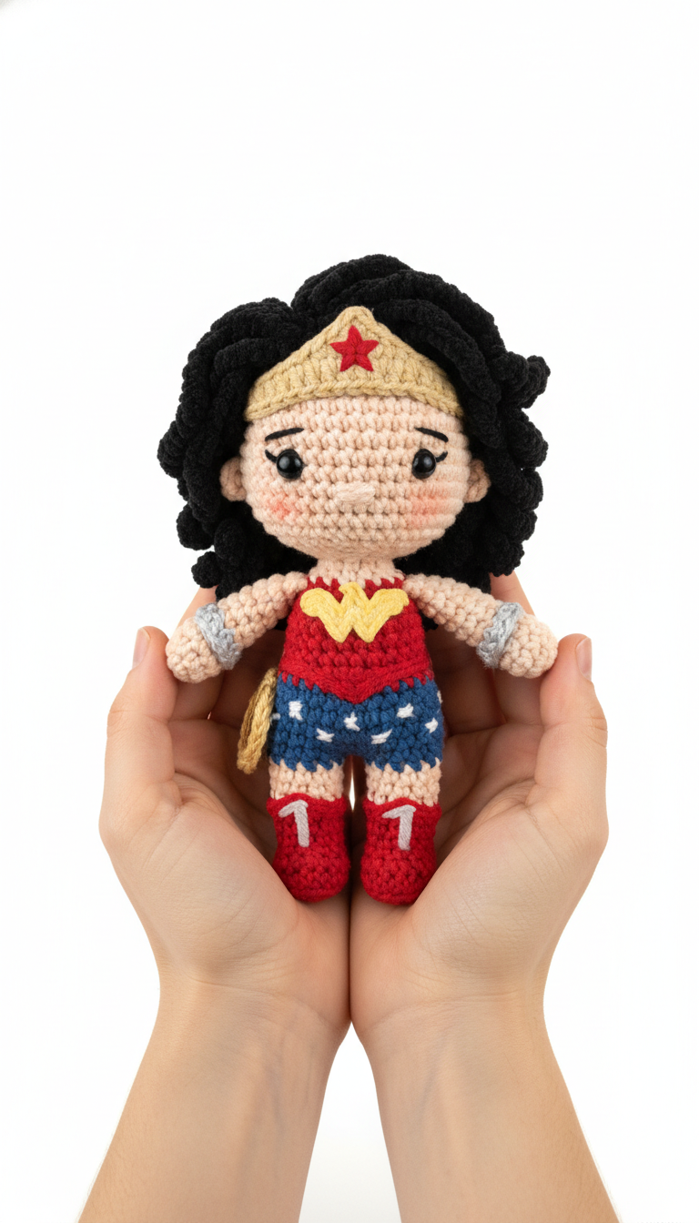Held gently in cupped hands, a vibrant Wonder Woman crochet doll captures the essence of heroism with its intricate details and charming design. This miniature rendition of the iconic Amazonian princess showcases the artistry of amigurumi. Each stitch brings to life her classic red, blue, and gold costume, complete with her tiara and Lasso of Truth. This delightful handmade piece celebrates both craftsmanship and beloved characters, appealing to collectors and fans alike. Its sweet expression adds a unique touch to this powerful figure.