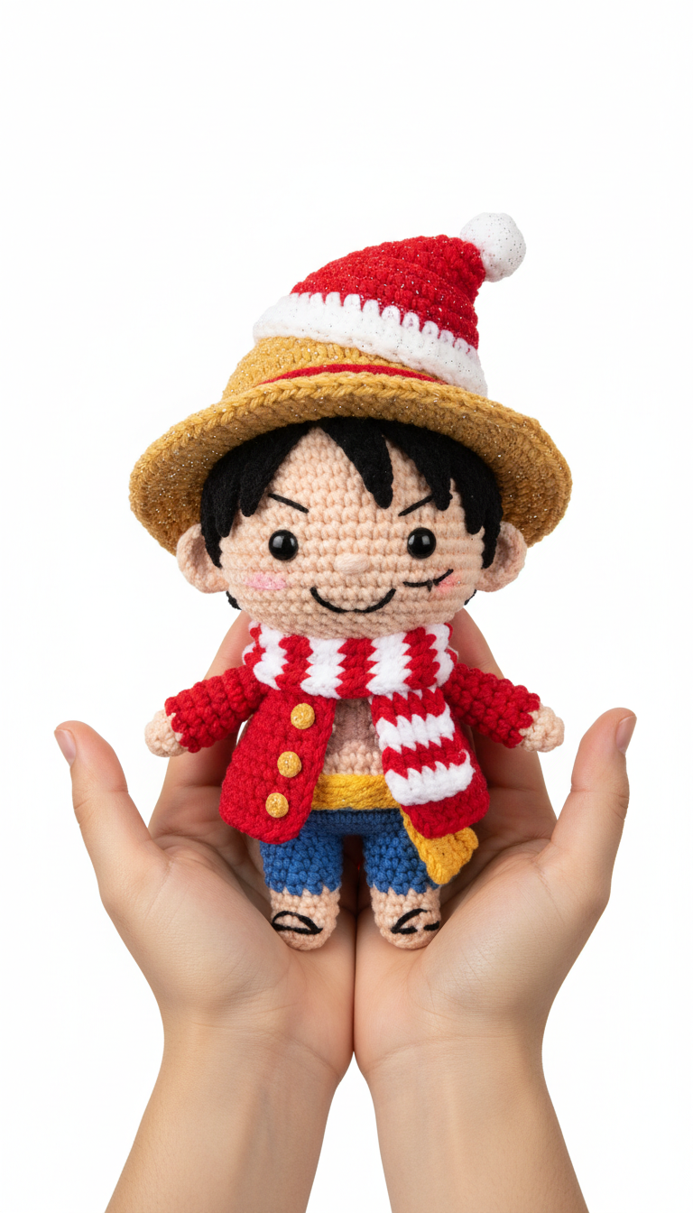Ahoy, matey! Bring the spirit of the Grand Line to your holiday season with this adorable Christmas Luffy Amigurumi crochet pattern. Perfect for One Piece fans, this chibi version of Monkey D. Luffy, complete with his iconic straw hat and a festive Santa hat and scarf, makes a delightful gift or a charming addition to your own collection. Get ready to embark on a fun crafting adventure!