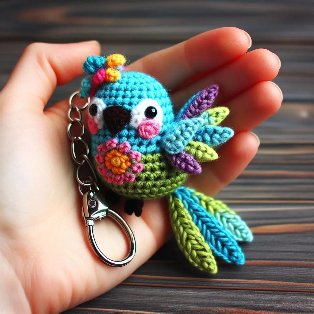 The construction of this amigurumi bird involves a variety of stitches that contribute to its detailed and sturdy form, making it perfect as a keychain. Techniques like the magic ring and single crochet stitches are likely employed here to create tight, secure fabric suitable for accessories that handle everyday wear and tear. The crochet flowers and leaves are examples of appliquรฉ work in crochet, attached post-creation to add depth and interest. This keychain not only serves as a practical accessory but also as a testament to the artistry and skill involved in crochet, appealing to those who appreciate handmade and artisanal crafts.