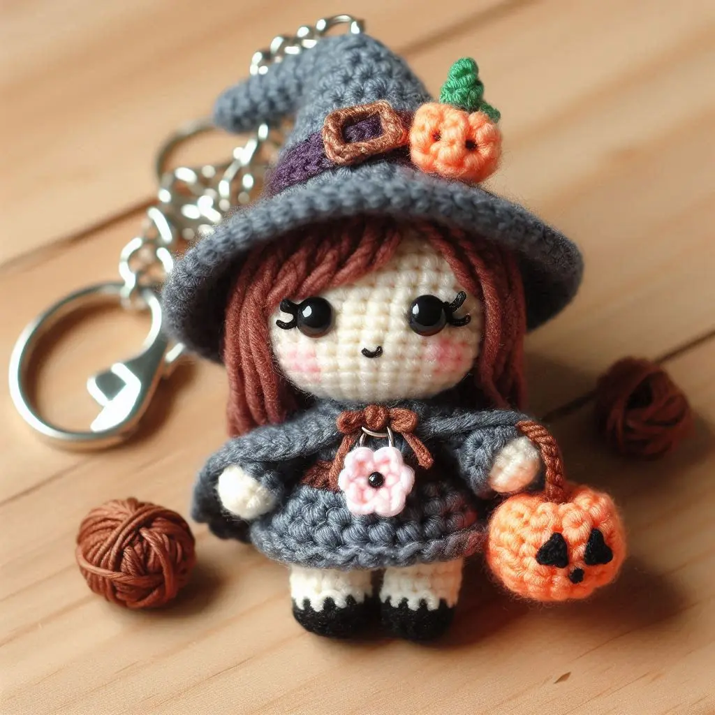 Amigurumi witch dolls are an adorable and fun crochet project for both beginners and advanced crafters. This particular amigurumi witch doll, complete with a pointy hat and a tiny pumpkin basket, is not only a perfect decoration for Halloween but also a charming keychain accessory. Its detailed features, including the tiny flower on her dress and the cute little cape, make it an irresistibly cute addition to any collection.