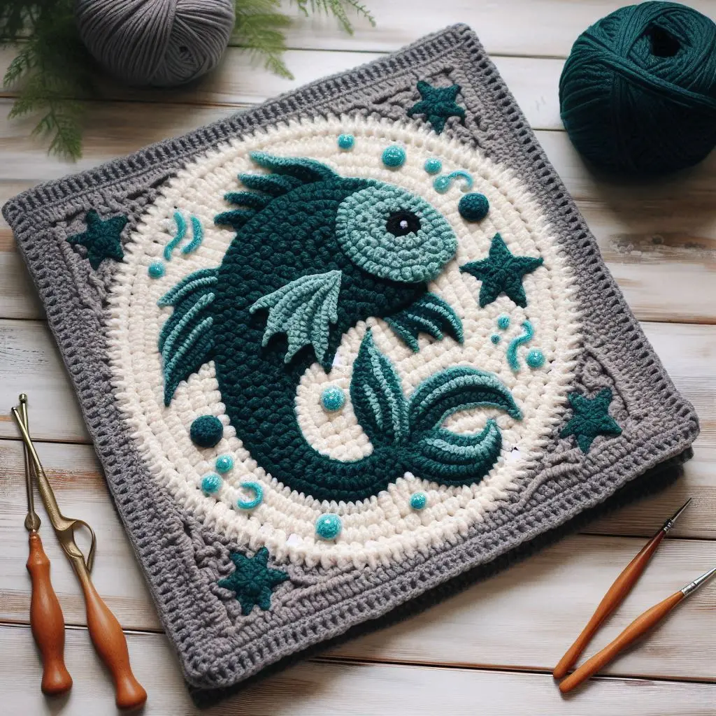 This beautiful fish crocheted blanket square is an exquisite piece that can be used to create a stunning blanket or wall hanging. Featuring a detailed fish design surrounded by stars and bubbles, this square adds a touch of elegance and whimsy to any project. The combination of textures and colors makes this piece a standout addition to your crochet work.