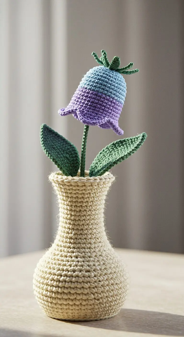 A single large bellflower in a gradient of purple and blue stands tall in a cream-colored crochet vase. The green leaves and elegant stem add realism to this handcrafted display.