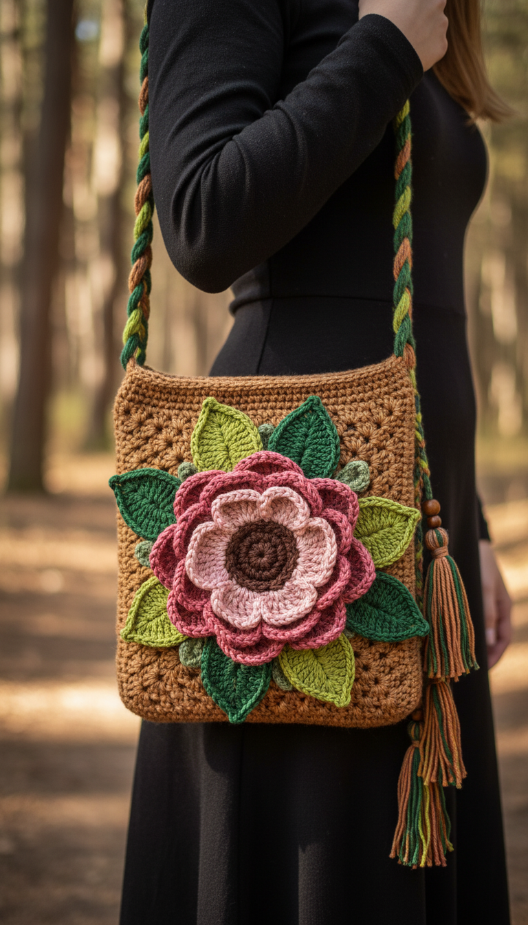 Embrace nature’s beauty with our captivating Crochet Floral Crossbody Bag pattern! This stunning accessory features a rich, textured body adorned with a vibrant, multi-layered flower and lush leaves. Perfect for adding a touch of handmade elegance to any outfit, this bag is both stylish and functional, carrying your essentials with ease and charm.