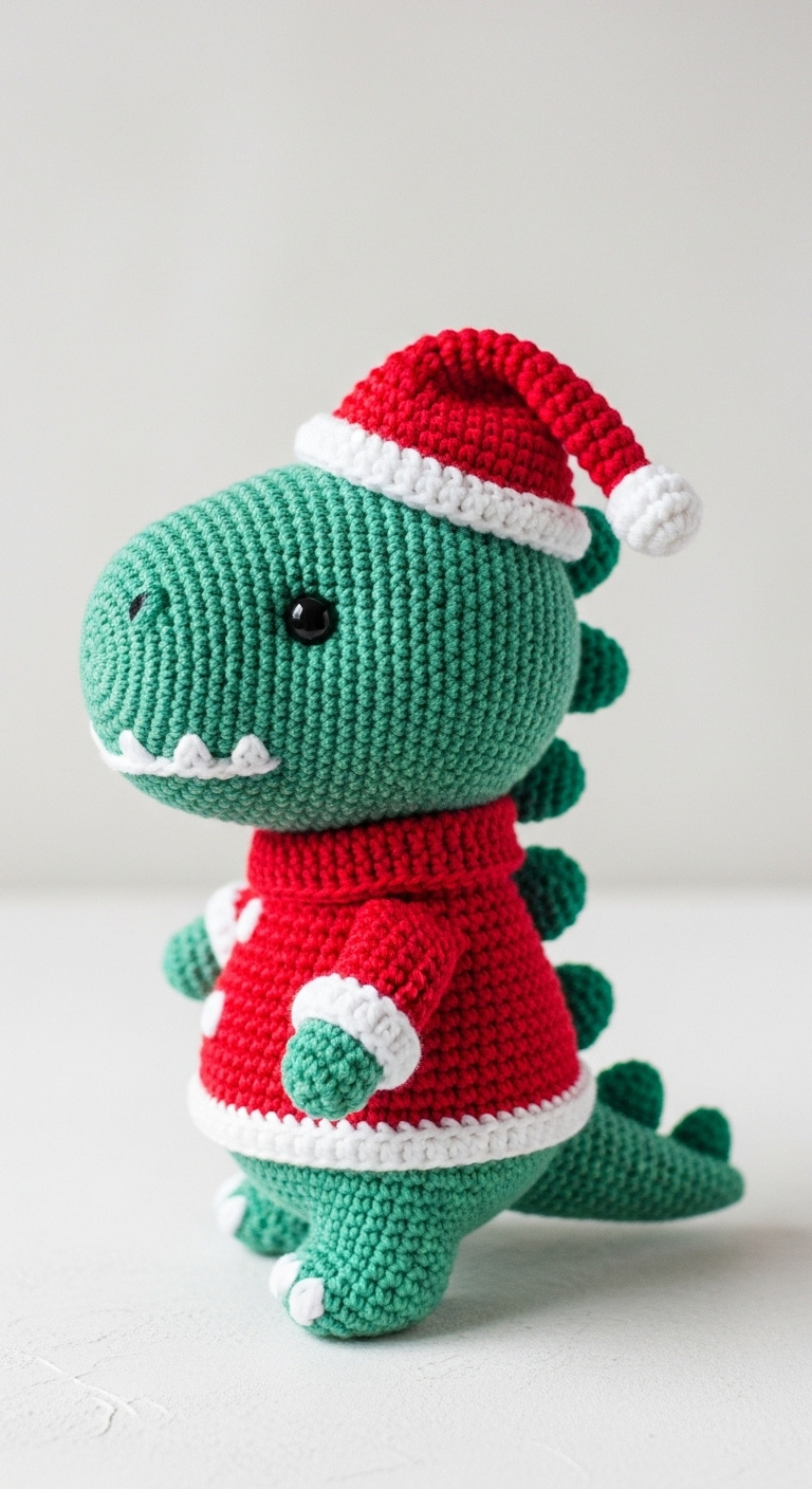 Discover the delightful world of Christmas dinosaur crochet, featuring an adorable amigurumi creature ready for the holidays. This charming piece showcases a green dinosaur adorned with a vibrant red Santa hat and matching sweater, perfectly embodying festive cheer. Such handmade creations make wonderful decorations or heartfelt gifts during the holiday season. The intricate crochet work highlights the dedication and skill involved in bringing this unique character to life, blending prehistoric fun with seasonal joy.