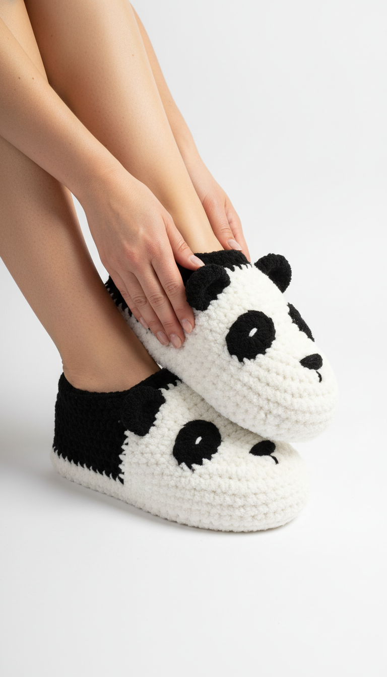 Step into ultimate comfort and cuteness with these adorable crochet panda slippers! Perfect for lounging around the house, these cozy foot warmers feature iconic black and white panda details, including sweet little ears and expressive eyes. This pattern is designed to guide you in creating a pair of plush, charming slippers that will bring a smile to anyone’s face.
