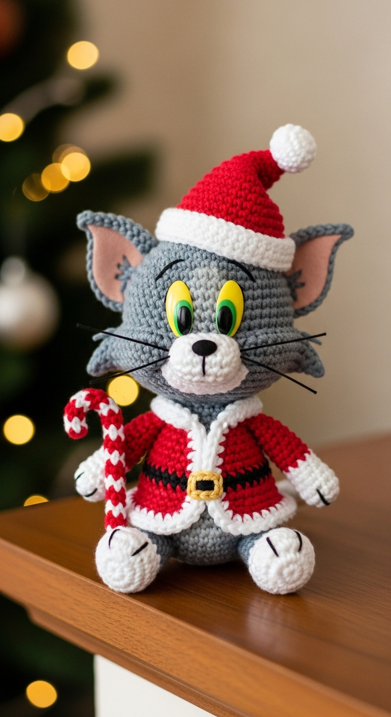 Discover the delightful charm of this special crochet Tom character. Dressed in a festive Santa outfit, this amigurumi cat captures the joyful spirit of the holidays. Its intricate design and vibrant colors make it a perfect decoration or gift. This adorable crochet Tom brings a touch of nostalgic fun to any Christmas setting. The classic cartoon character is beautifully rendered in yarn, holding a tiny candy cane.