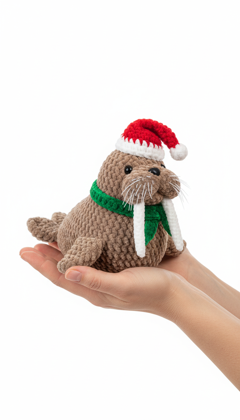 Bring joy and a unique handcrafted touch to the holiday season with this delightful walrus. Its soft texture and charming details, from the little tusks to the whimsical Santa hat, make it an instant favorite. This pattern is designed to be straightforward, allowing you to create a beautiful, huggable companion that embodies the warmth and spirit of winter festivities.