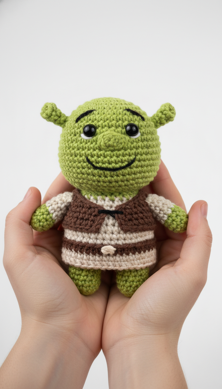 A delightful handcrafted Shrek amigurumi takes center stage, cradled gently in open hands against a pristine white background. This adorable crochet figure captures the iconic character with remarkable detail, from his vibrant green skin to his distinctive brown vest. The soft texture and meticulously stitched features highlight the artistry involved in creating such a beloved character. This particular Shrek amigurumi showcases the enduring appeal of handmade crafts.