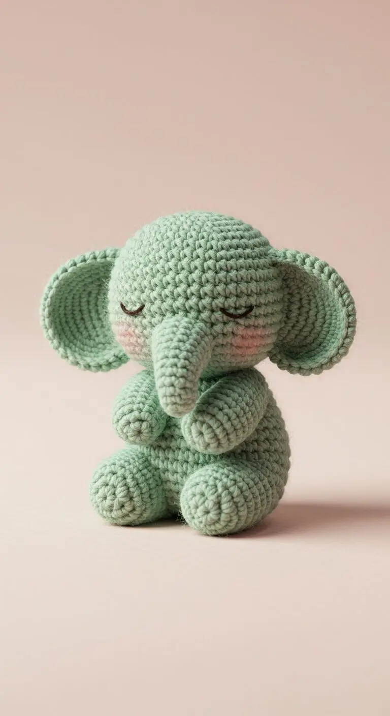 This soft mint green crochet elephant features delicate pink cheeks and folded arms. Its upright pose and closed eyes make it look calm and content.