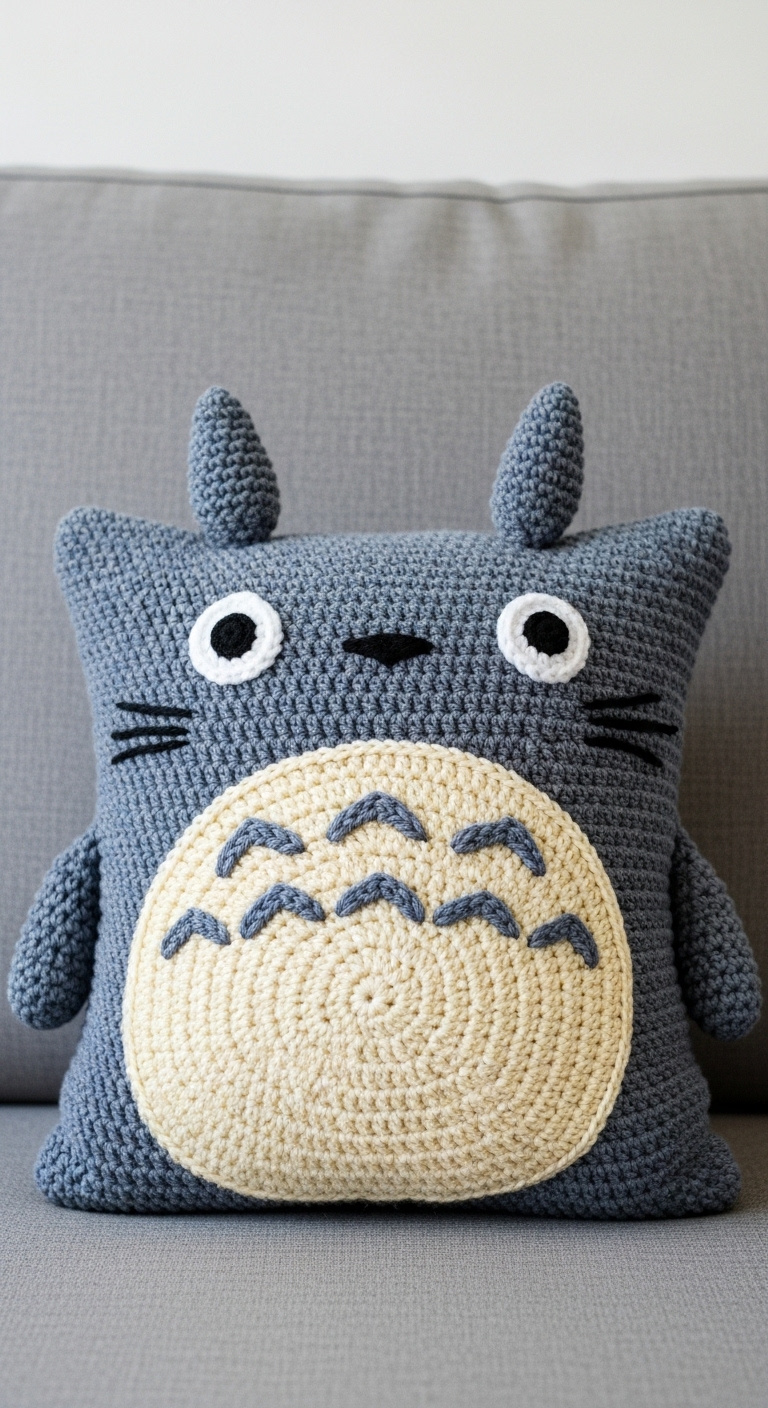 Welcome the gentle forest spirit into your home with this adorable Totoro crochet pillow pattern! Perfect for fans of Studio Ghibli, this project combines comfort with iconic charm. This detailed guide will help you create a cozy, handmade Totoro pillow that will surely become a beloved piece in any room, adding a touch of whimsy and warmth to your decor.