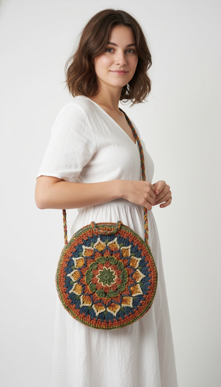 Embrace bohemian chic with our stunning Crochet Circle Bag! This eye-catching accessory features a beautiful mandala-inspired design in a vibrant palette of olive green, mustard yellow, dark teal, burnt orange, and cream. Perfect for adding a touch of unique, handmade style to any outfit, this bag is both practical and fashionable.