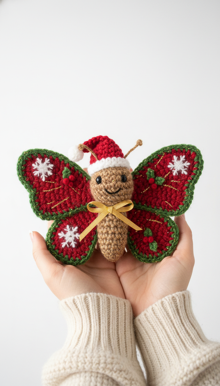 Flutter into the most wonderful time of the year with this adorable Christmas Crochet Butterfly Amigurumi! This charming little insect, decked out in its festive Santa hat and sparkling wings, is perfect for adding a handmade touch to your holiday decorations. Whether adorning your tree, gracing a mantelpiece, or becoming a unique gift, this butterfly is sure to bring joy and a sprinkle of magic to your festive season.