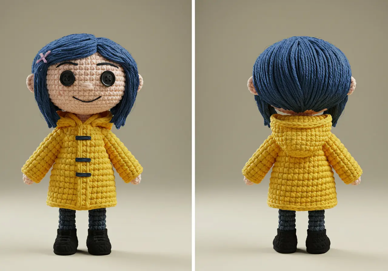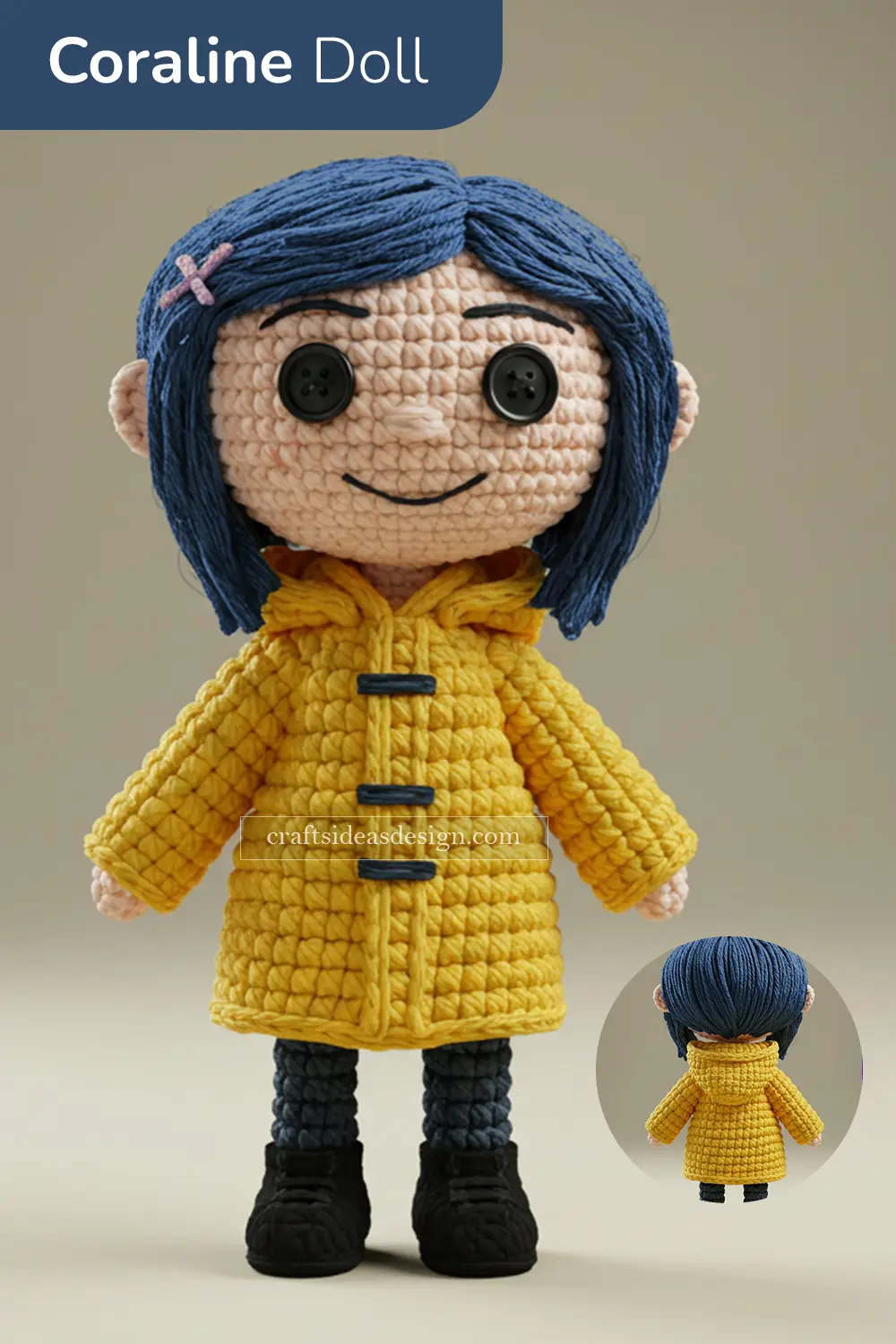 This Coraline doll crochet is a handcrafted masterpiece that brings the iconic character to life through the art of amigurumi. From her signature blue hair to the bright yellow raincoat and eerie black button eyes, every detail is designed to perfectly capture Coraline’s unique charm and mystery. This doll is a must-have for fans of the beloved animated film and a wonderful collectible for crochet lovers.