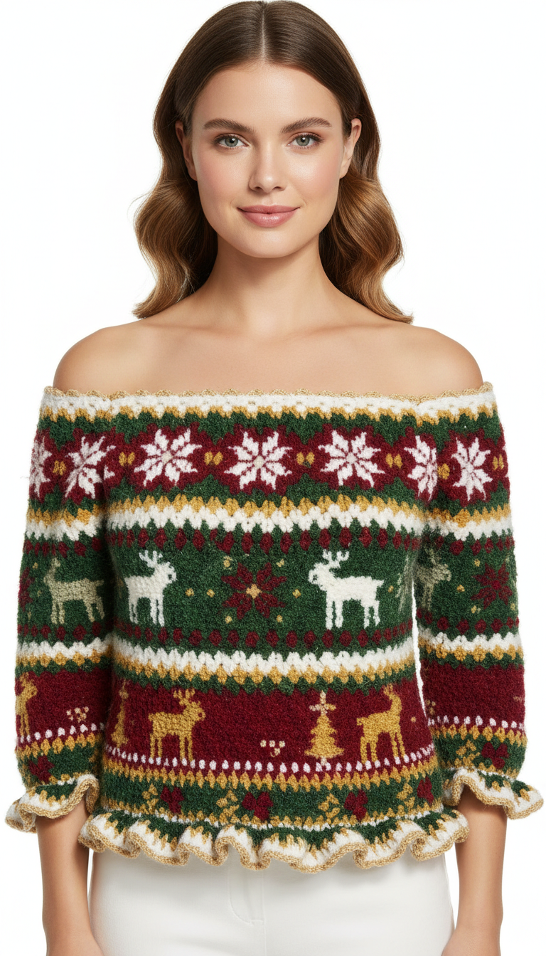 Embrace the holiday spirit with this stunning Fair Isle Off-Shoulder Christmas Sweater! Featuring charming reindeer, delicate snowflakes, and festive Christmas trees, this cozy jumper is perfect for holiday gatherings or a festive everyday look. The elegant off-shoulder design adds a touch of modern chic to a classic seasonal motif, making it a truly unique piece for your winter wardrobe.