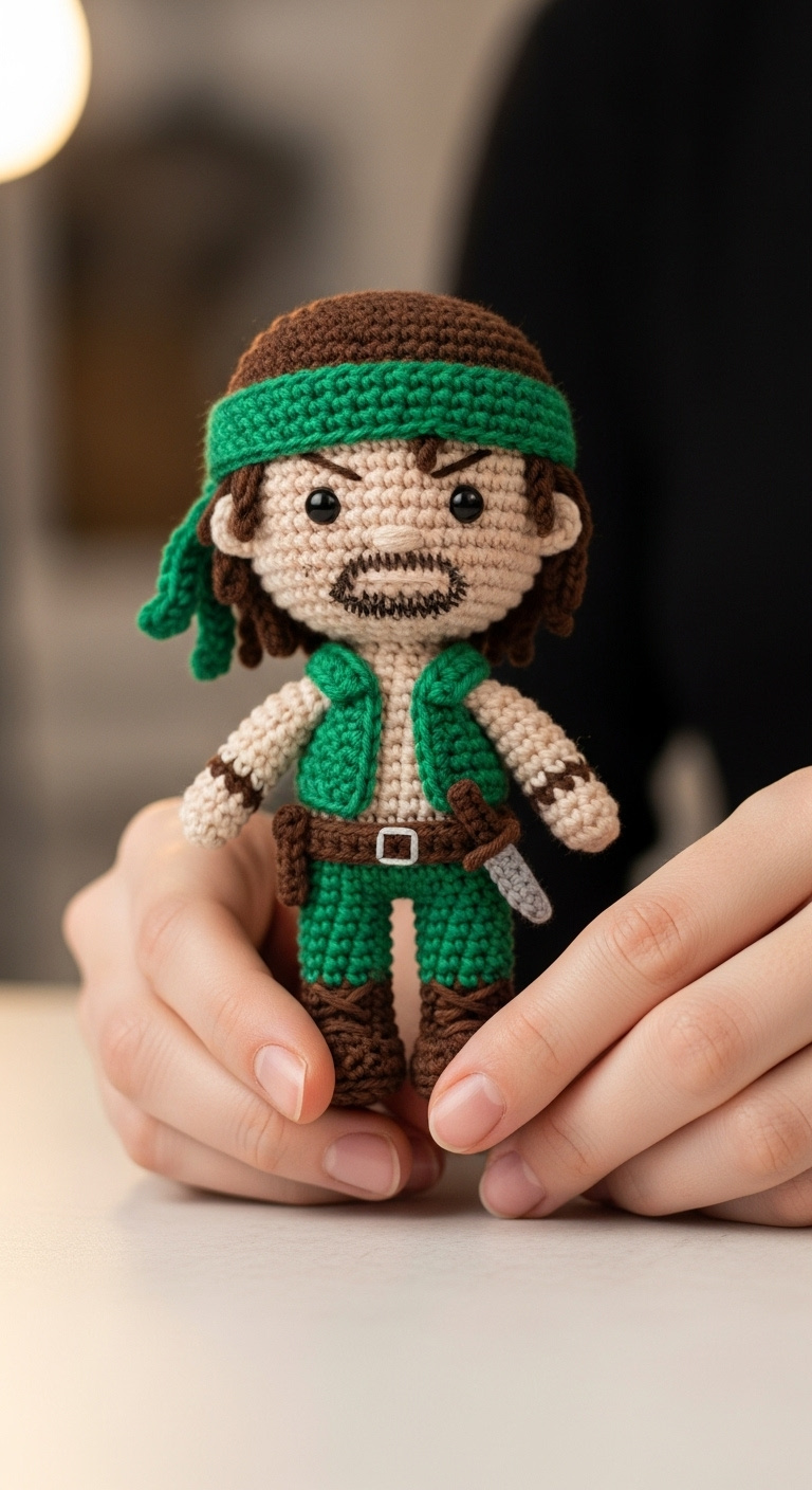 Discover the intricate details and charm of a handcrafted Amigurumi warrior doll. This captivating crochet figure features a green bandana, vest, and pants, complete with a tiny knife, embodying a spirit of adventure. Each stitch brings this unique character to life, showcasing the dedication of skilled artisans. An Amigurumi warrior doll makes a fantastic gift or a wonderful addition to any collection of handmade toys. Its robust design and expressive face promise endless imaginative play or decorative appeal.