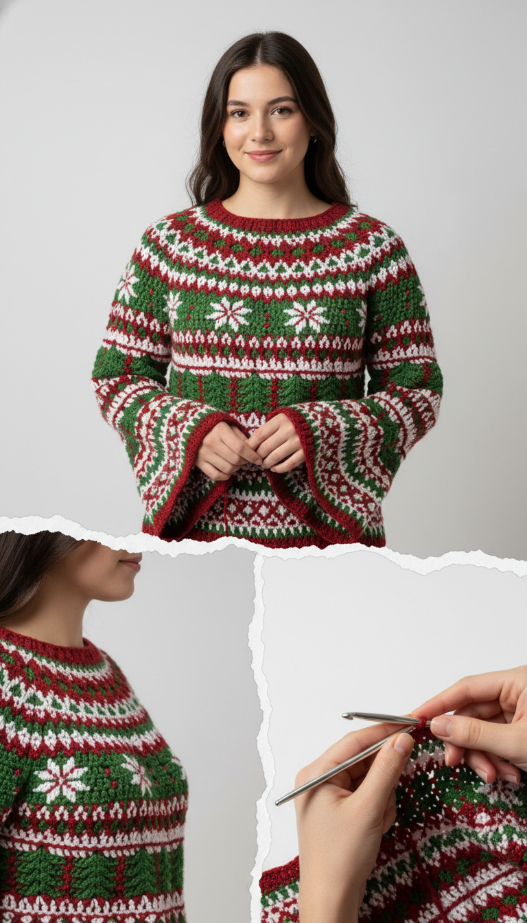 Embrace the holiday spirit with our enchanting Festive Fair Isle Crochet Sweater Pattern! This cozy pullover features a beautiful top-down, seamless construction, adorned with classic Christmas motifs like snowflakes and charming trees. Perfect for holiday gatherings or a warm winter’s day, this sweater will be a cherished handmade addition to your wardrobe.