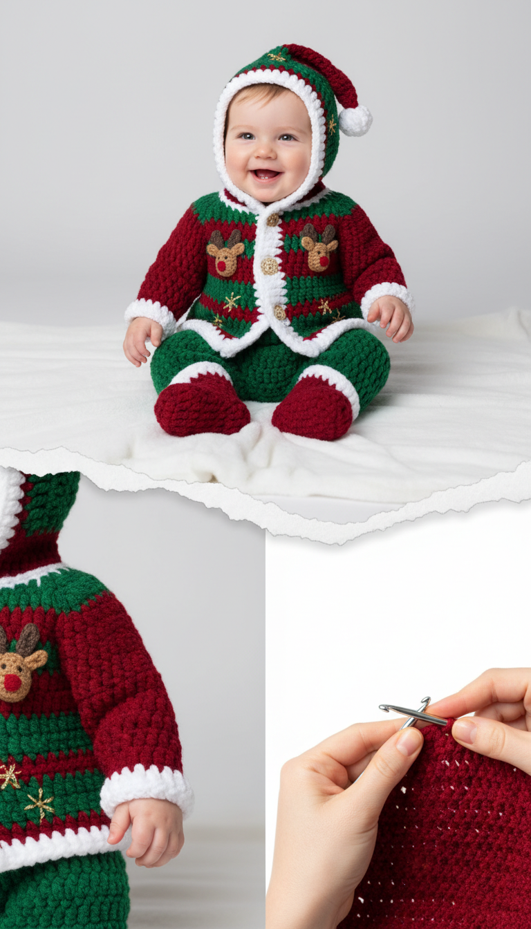 Get ready to spread holiday cheer with this absolutely enchanting crochet baby elf costume! Perfect for festive photoshohoots, Christmas parties, or simply making your little one the star of the season. This delightful outfit features vibrant holiday colors, charming reindeer appliques, and a playful pointed hood, ensuring your baby looks irresistibly cute and cozy.