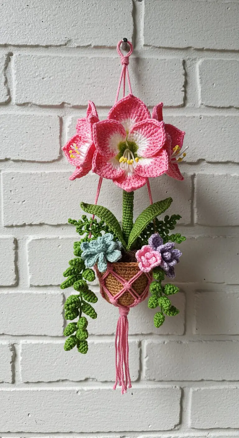 A delicate hanging garden featuring a pink crochet amaryllis bloom surrounded by small crochet succulents and trailing greenery, all arranged in a macrame-style pot.