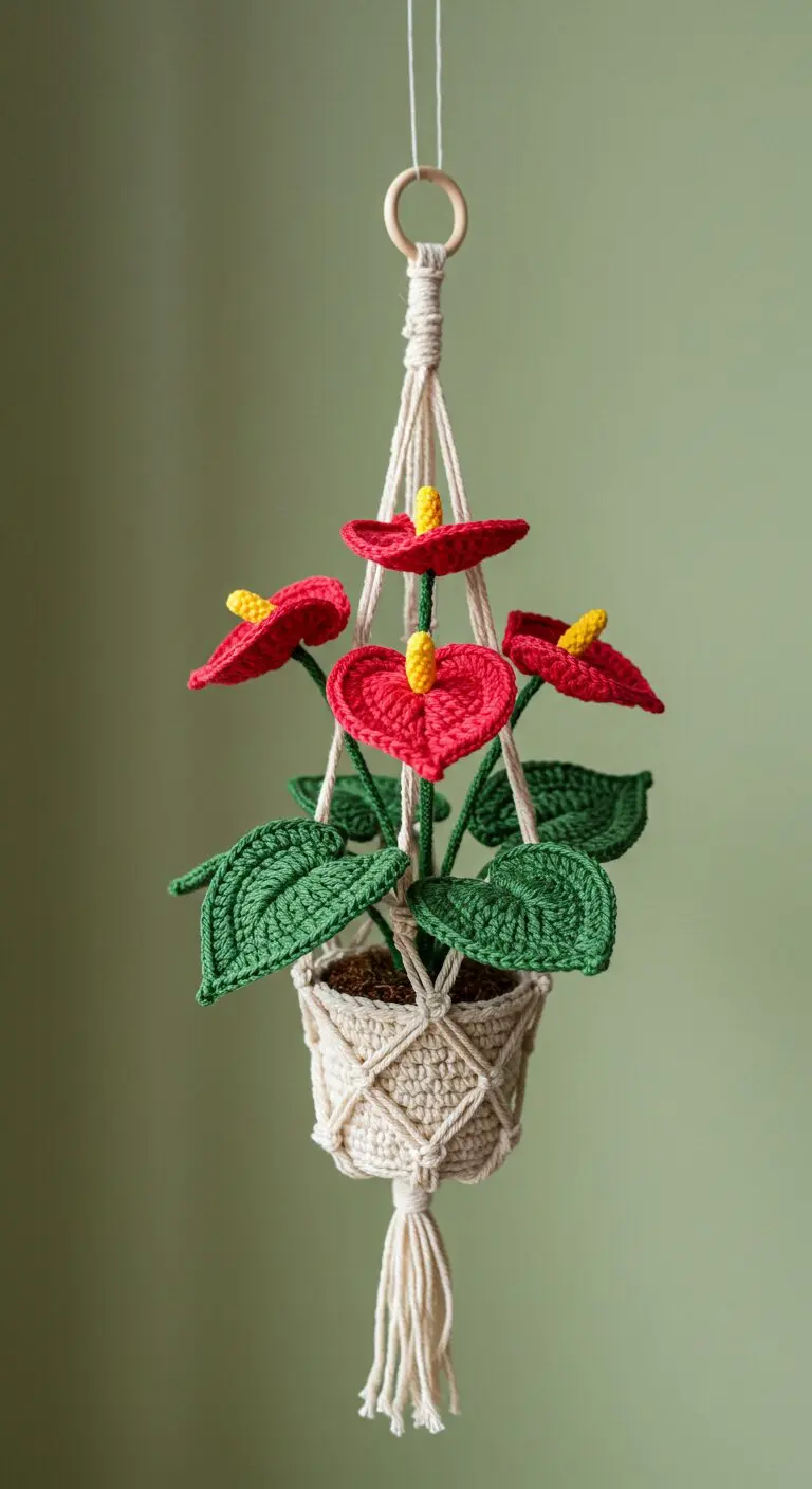 Whether you’re an experienced crocheter looking for a charming new project or a beginner eager to try amigurumi plants, this detailed guide will walk you through every step. You’ll learn how to create the distinctive heart-shaped anthurium flowers, vibrant green leaves, and even a lovely macrame-style hanging basket.