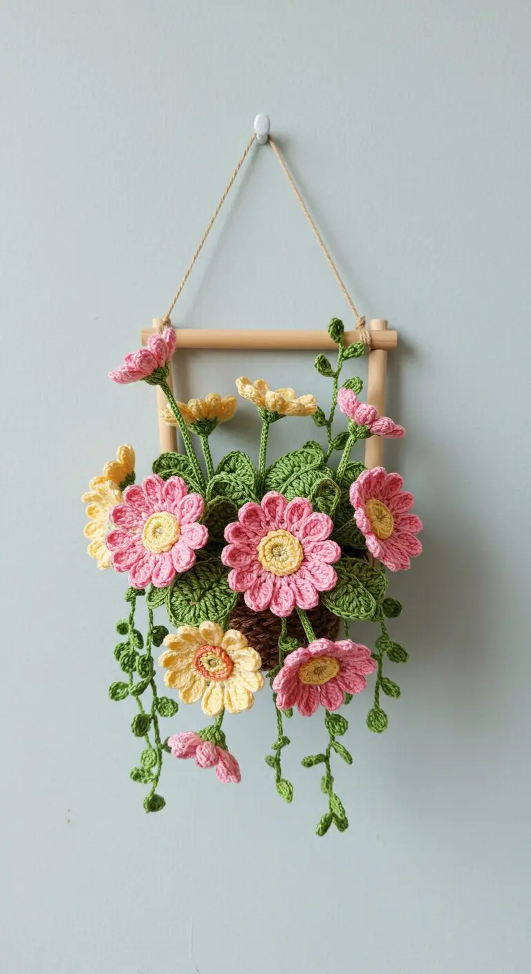 This enchanting project guides you through creating delicate crochet daisies, lush green leaves, and trailing vines, all nestled within a charming little basket and framed by a simple wooden hanger. It’s a delightful way to add a pop of color and a cozy, handcrafted feel to any room. Perfect for intermediate crocheters or adventurous beginners!