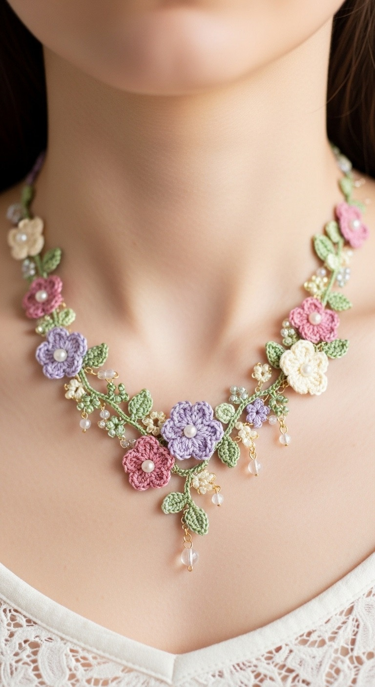Embrace the delicate charm of spring with this stunning crocheted floral garland necklace. Featuring an array of dainty blossoms and lush leaves in pastel hues, this piece adds a touch of handmade elegance to any outfit. Perfect for weddings, garden parties, or simply elevating your everyday style, this pattern guides you through creating your own wearable garden masterpiece with a beautiful beaded finish.