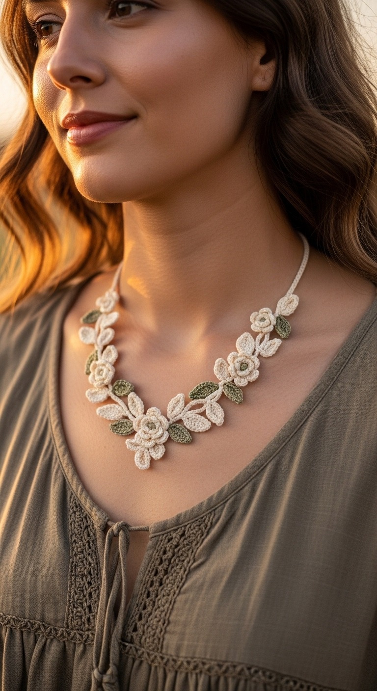 Adorn yourself with the delicate beauty of nature with our enchanting Crochet Floral Necklace pattern. This elegant piece features charming cream blossoms nestled among soft sage green leaves, creating a stunning handcrafted accessory. Perfect for adding a touch of rustic sophistication to any outfit, this necklace makes a beautiful statement or a thoughtful, personalized gift.