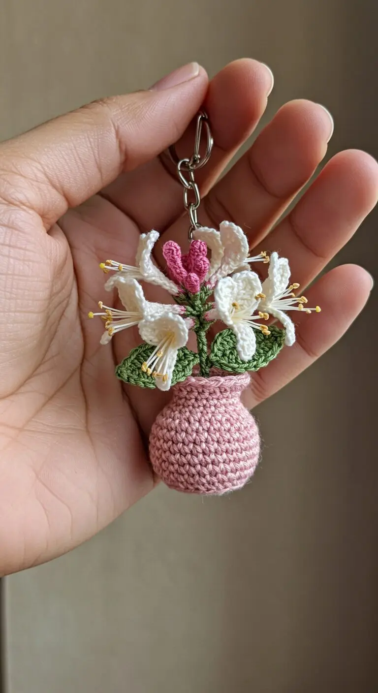 Are you looking for a charming way to personalize your keys or add a touch of handmade elegance to your bag? This delightful Crochet Floral Vase Keychain pattern is the perfect project to bring a miniature garden wherever you go!