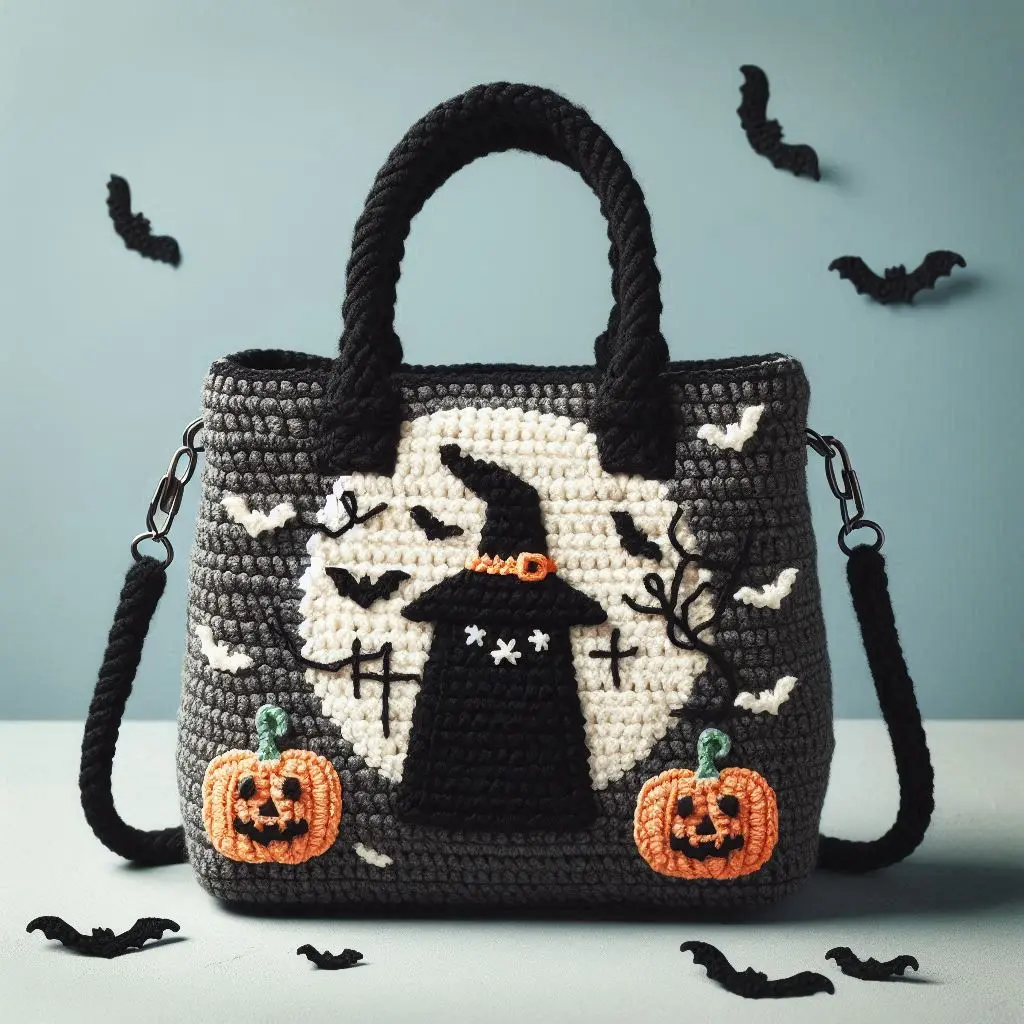 Crochet Halloween Witch Bag projects are an excellent way to showcase your creativity and get into the spooky spirit of Halloween. This unique bag features a charming witch silhouette set against a full moon, complete with bats, pumpkins, and a graveyard scene. The intricate details and vibrant colors make this bag a standout accessory for the season.