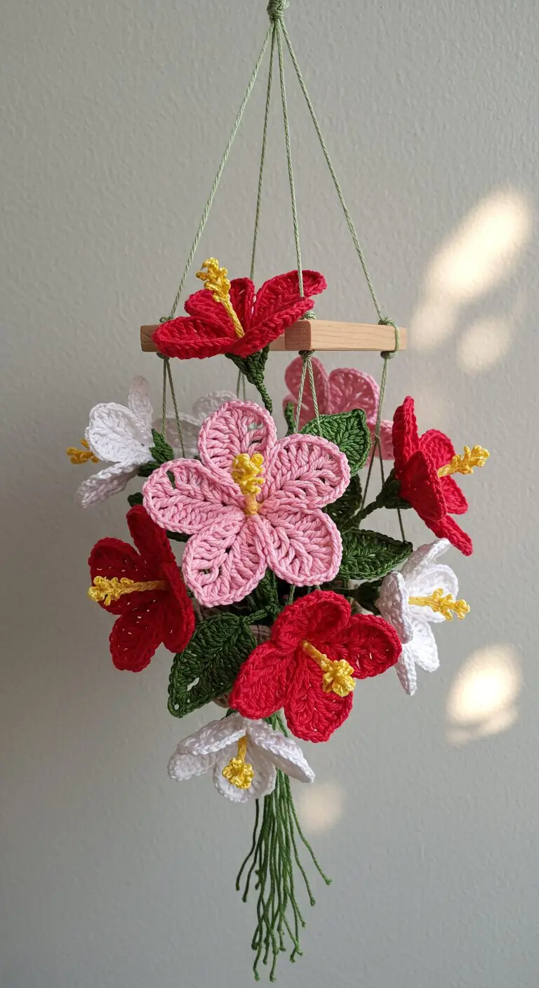 Vibrant Crochet Hibiscus Hanging Bouquet