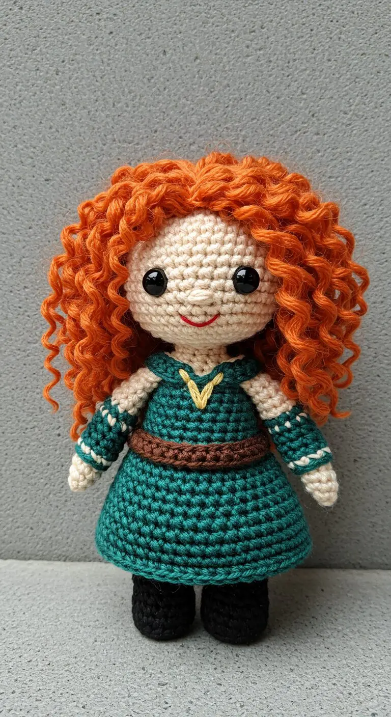 Crochet Merida – Brave amigurumi doll brings the fierce Scottish princess to life in a soft and handmade version. With her signature fiery curly red hair, emerald green dress, and confident smile, this crochet Merida is a tribute to the beloved Disney character known for her bravery and independence. She’s perfect for fans of Brave, collectors of princess dolls, or those who admire detailed crochet artistry.