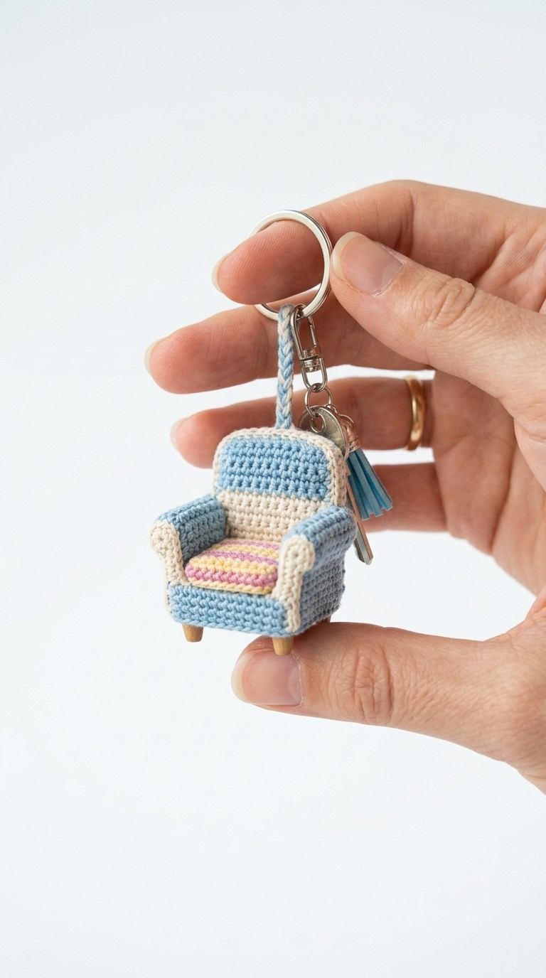 Bring a touch of cozy charm wherever you go with this adorable crochet mini armchair keychain! Perfect for adding a unique flair to your keys or bag, this amigurumi project is surprisingly simple to make. Follow our detailed pattern to create your own miniature piece of furniture, complete with tiny legs and a striped cushion, making it an ideal gift for crafters and home decor lovers alike.