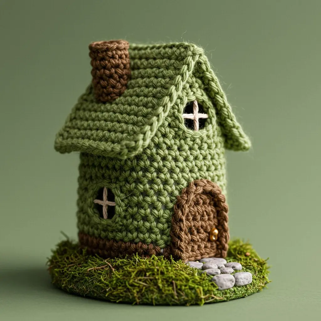 This simple green crochet mini house features a textured roof and a cozy brown door, set on a mossy base. Its minimalist design makes it a perfect accent for a natural-themed decor, adding a subtle charm to any room.