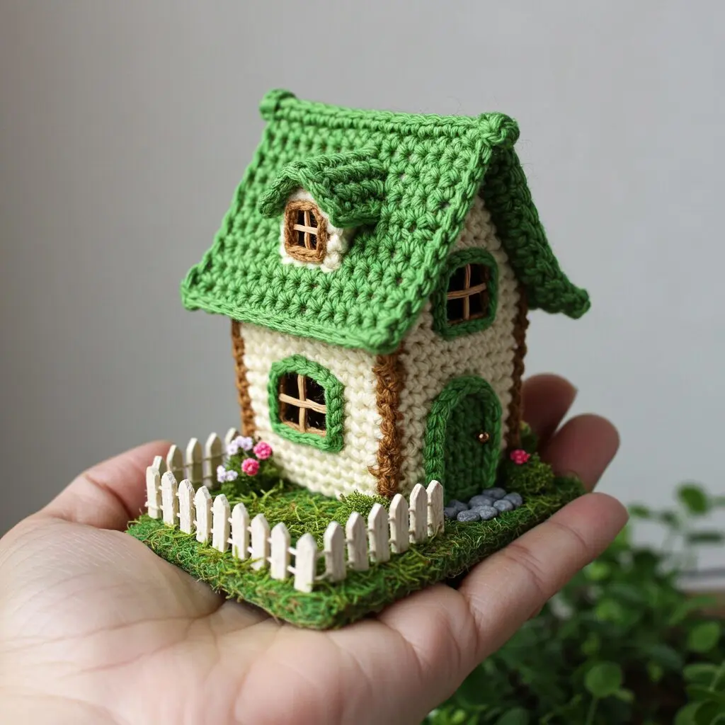 With a light green roof and a tiny crochet tree, this mini house blends perfectly with nature-inspired decor. The leaves and fence add a rustic charm, making it a great choice for both indoor and outdoor settings.