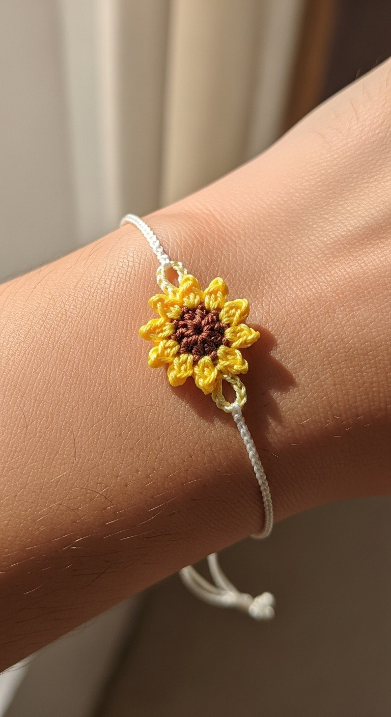 There’s something uniquely special about wearing a piece you’ve created with your own hands. This crochet sunflower bracelet isn’t just an accessory; it’s a tiny burst of joy, symbolizing happiness and warmth. It’s perfect for summer festivals, thoughtful gifting, or simply adding a cheerful touch to your daily style. Its delicate design and vibrant colors will surely bring a smile.