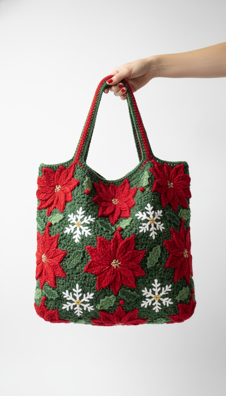 Embrace the holiday spirit with this stunning Poinsettia & Snowflake Holiday Tote Bag! Perfect for carrying gifts, groceries, or your latest project, this festive bag features vibrant red poinsettias, delicate white snowflakes, and charming holly accents on a deep green background. It’s an intermediate crochet project that brings joy and cheer wherever it goes, making it an ideal handmade gift or a beautiful accessory for yourself.