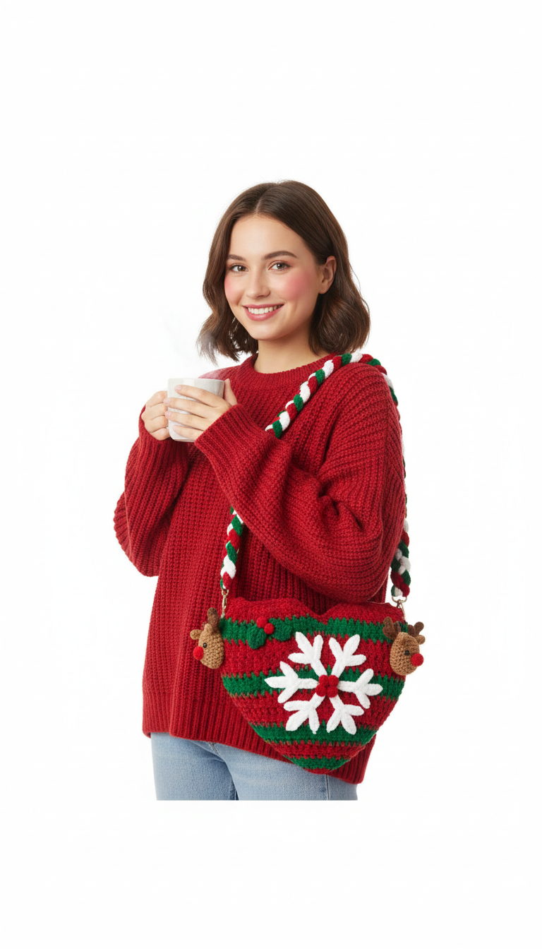 Embrace the holiday spirit with this adorable Crochet Christmas Heart Bag! Featuring charming green stripes, a delicate white snowflake, and two cute reindeer appliques, this cross-body bag is the perfect accessory for festive gatherings. It’s a wonderful way to add a touch of handmade cheer to your winter wardrobe or to gift to a loved one.