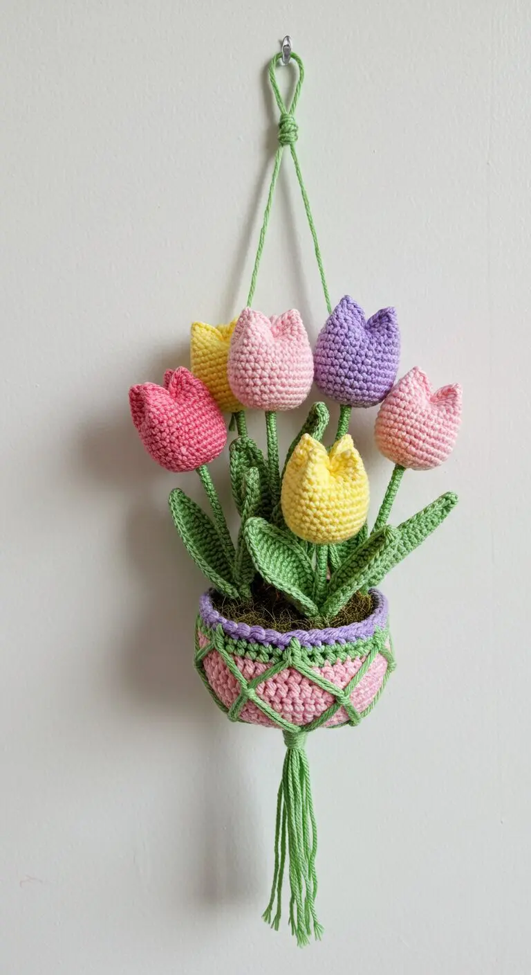 A beautiful bundle of pastel crochet tulips nestled in a pink crochet pot, suspended in a macramรฉ-style hanger for a soft and charming wall accent.
