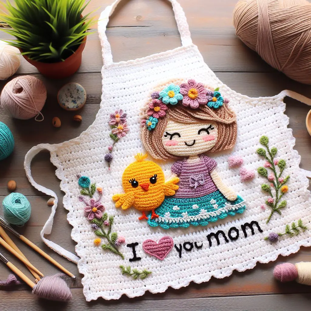 This delightful crocheted apron celebrates the charm and sentimentality of Mother’s Day through the art of amigurumi. The piece prominently features a joyful amigurumi girl adorned with a floral crown, accompanied by a cheerful yellow chick. These figures are intricately crocheted, displaying vibrant shades of purple, yellow, and pastel greens and pinks, creating a warm and inviting color palette. The words “I love you mom” are gracefully embedded at the bottom, stitched in a simple yet elegant font, enhancing the apron’s heartfelt message.