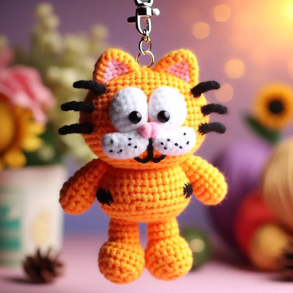 This image showcases a vibrant handmade Crochet Garfield Keychain. The tiger is crafted in bright orange and black yarn, with meticulous attention to its striped pattern and adorable facial features. The keychain features a prominent metal clasp at the top, highlighting its functionality and charm. The setting includes a wooden surface and a soft, blurred background adorned with delicate roses, adding a touch of warmth and contrast to the bright tiger design.