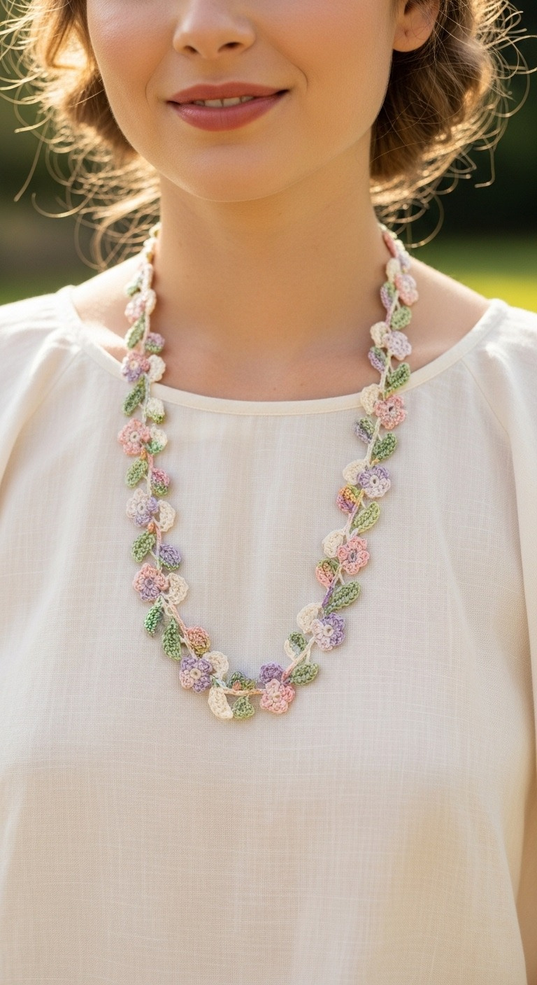Embrace spring’s beauty with this exquisite crochet floral necklace! Adorned with tiny pastel blooms and delicate green leaves, this pattern guides you to create a charming accessory. Perfect for adding a touch of handmade elegance to any outfit, it’s a delightful project for crocheters looking for a unique and personal touch.