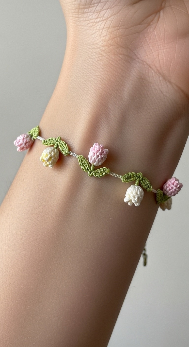 Embrace the beauty of spring and summer all year round with this enchanting Crochet Tulip Bud Bracelet! This delicate floral wristwear features charming little tulip buds and leaves, handcrafted with fine yarn. Perfect for adding a touch of whimsical elegance to any outfit or as a thoughtful, personalized gift. Get ready to crochet your own blooming accessory!