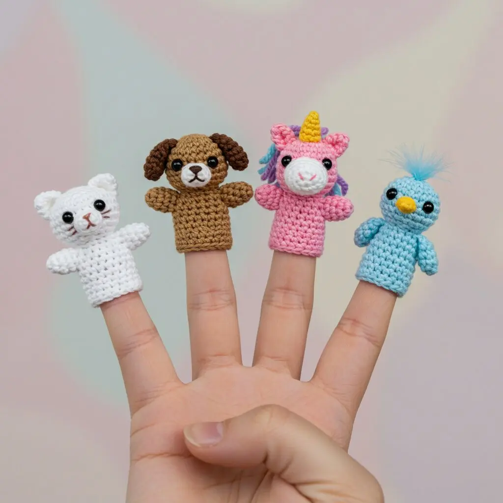 These charming little friends aren’t just toys; they are tools for developing storytelling skills and fostering emotional expression. Whether it’s a brave dog, a majestic unicorn, a playful cat, or a chirpy bird, each crochet finger puppet invites children and adults alike to embark on countless imaginative adventures. Their soft texture and vibrant colors make them irresistible, promising hours of engaging entertainment and cherished memories.