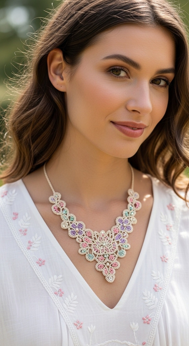 Thread crochet allows for incredibly intricate and delicate designs, making it ideal for creating wearable art like this necklace. The combination of fine thread and precise stitches results in a lightweight yet luxurious accessory that can be cherished for years. Discover the joy of crafting a unique piece that reflects your personal style and skill.